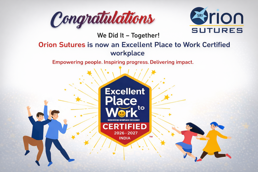 We are proud to share a significant milestone in our journey of excellence and growth. Orion Sutures has officially been recognized as an Excellent Place to Work Certified workplace for the year 2026–2027 in India. This achievement reflects our unwavering commitment to building a positive, empowering, and high-performance work culture for every member of our organization. At Orion Sutures, we firmly believe that people are the foundation of progress. This certification is not just an award—it is a testament to the dedication, collaboration, and passion demonstrated by our employees every single day. Together, we have created an environment where innovation thrives, teamwork flourishes, and individuals are encouraged to reach their full potential. A Recognition Built on Trust and Teamwork The Excellent Place to Work certification is awarded to organizations that demonstrate exceptional standards in employee satisfaction, workplace culture, leadership, and organizational values. Achieving this recognition highlights our continuous efforts to maintain a workplace that prioritizes employee well-being, professional development, and mutual respect. Our team members are at the heart of everything we do. Their commitment to quality, safety, and customer satisfaction drives our success in delivering reliable surgical solutions to healthcare professionals worldwide. This recognition reinforces our belief that when employees feel valued and supported, they perform at their best and contribute meaningfully to organizational growth. Our Workplace Philosophy: Empowering People, Inspiring Progress, Delivering Impact At Orion Sutures, our workplace culture is built around three core principles that guide our daily operations and long-term vision. Empowering People: We provide our employees with the tools, training, and opportunities they need to succeed. By fostering a culture of continuous learning and skill development, we ensure that our workforce remains confident, capable, and future-ready. Inspiring Progress: Innovation and improvement are part of our daily operations. We encourage new ideas, embrace change, and strive to enhance our processes, products, and services to meet evolving healthcare needs. Delivering Impact: Our work goes beyond manufacturing surgical products. Every suture we produce contributes to patient care, surgical success, and improved healthcare outcomes. We take pride in making a meaningful difference in the lives of patients and medical professionals. What This Certification Means for Our Stakeholders For Employees: This recognition validates the supportive and inclusive environment we have built together. It reinforces our commitment to employee satisfaction, safety, and career growth. For Customers and Healthcare Professionals: It assures our partners that Orion Sutures operates with integrity, professionalism, and a strong culture of quality—values that directly influence the reliability of our products and services. For Business Partners and Distributors: This certification reflects organizational stability, ethical practices, and a long-term vision for sustainable growth. Our Commitment Moving Forward Receiving the Excellent Place to Work certification motivates us to continue strengthening our workplace culture and operational excellence. We remain dedicated to maintaining the highest standards in employee engagement, product quality, and customer satisfaction. As we move forward, Orion Sutures will continue to invest in people, technology, and innovation to support the evolving needs of the healthcare industry. Our goal is not only to be a leader in surgical solutions but also to remain a workplace where individuals feel proud, motivated, and inspired to contribute